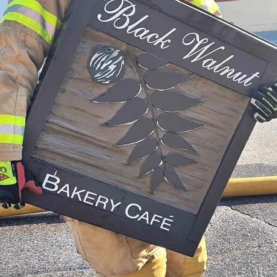 One of the most poignant post-fire photographs was of a fireman carrying The Black Walnut’s sign to give to the owners.